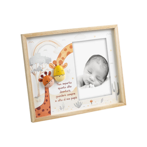 Portaritratti legno color naturale con giraffa bianca sagomata in rilievo. Per foto verticale. Styled by Felix.