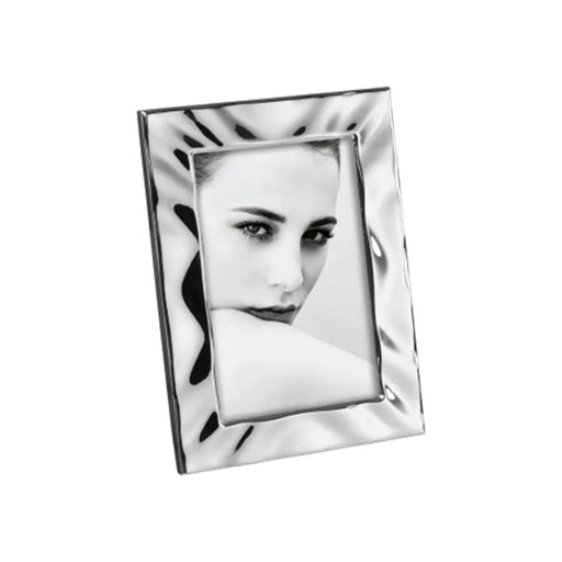 Portafoto in metallo stampato, finitura argento satinato, con angoli in argento lucido. Orientabile in senso orizzontale e verticale. Schienale...